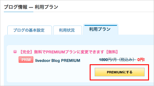 ブログURL設定を開くと最下部に「独自ドメインを使用する」という項目がありますが、ラジオボタンが選択できないようになっています。そこで「有料プランのお申し込み」ボタンをクリックします。 無料じゃなかったの?と一瞬思いますが大丈夫です。 ちゃんと無料になっているのを確認して[PREMIUMにする]ボタンをクリックする。