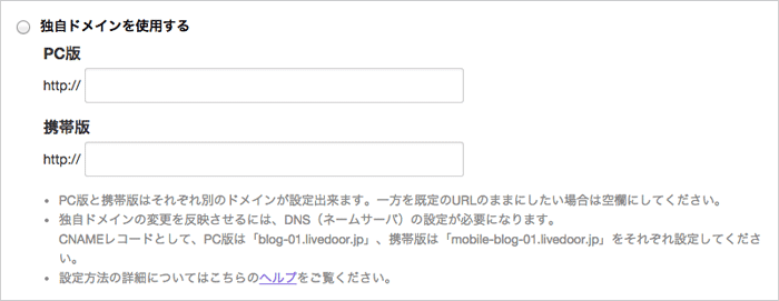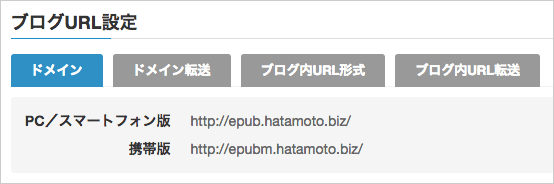 これでやっとブログのURLに独自ドメインを設定することが可能になりました。[ブログURL]の設定ページに戻りましょう。「独自ドメインを使用する」のラジオボタンを選択するとPC版と携帯版にそれぞれ別の独自ドメインを設定できるようになります。 今回は、hatamoto.biz のサブドメイン epub.hatamoto.biz でドメイン設定してみました。携帯版は、epubm.hatamoto.biz にしました。 当然ですが、ドメインは自分が所有しているドメインでなければ使えません。そしてドメイン側のCNAMEレコードを設定する必要があります。この意味がわからなければ混乱するかもしれませんが難しくありませんのでご安心ください。詳しくはヘルプに書かれています。サブドメインを使う場合